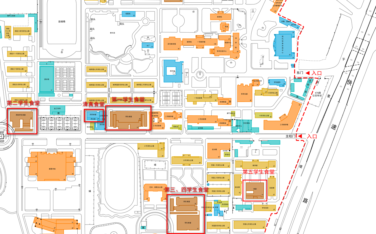 校内食堂:第一学生食堂、第二学生食堂、第三学生食堂、第四学生食堂、第五学生食堂、民族食堂